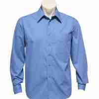 - Standard collar with left chest pocket Traditional business shirt fit with 2 back shoulder pleats 50% Cotton, 50% Polyester Easy iron – yarn dyed fabric Available in Mid Blue (as shown) Navy and Light Sky